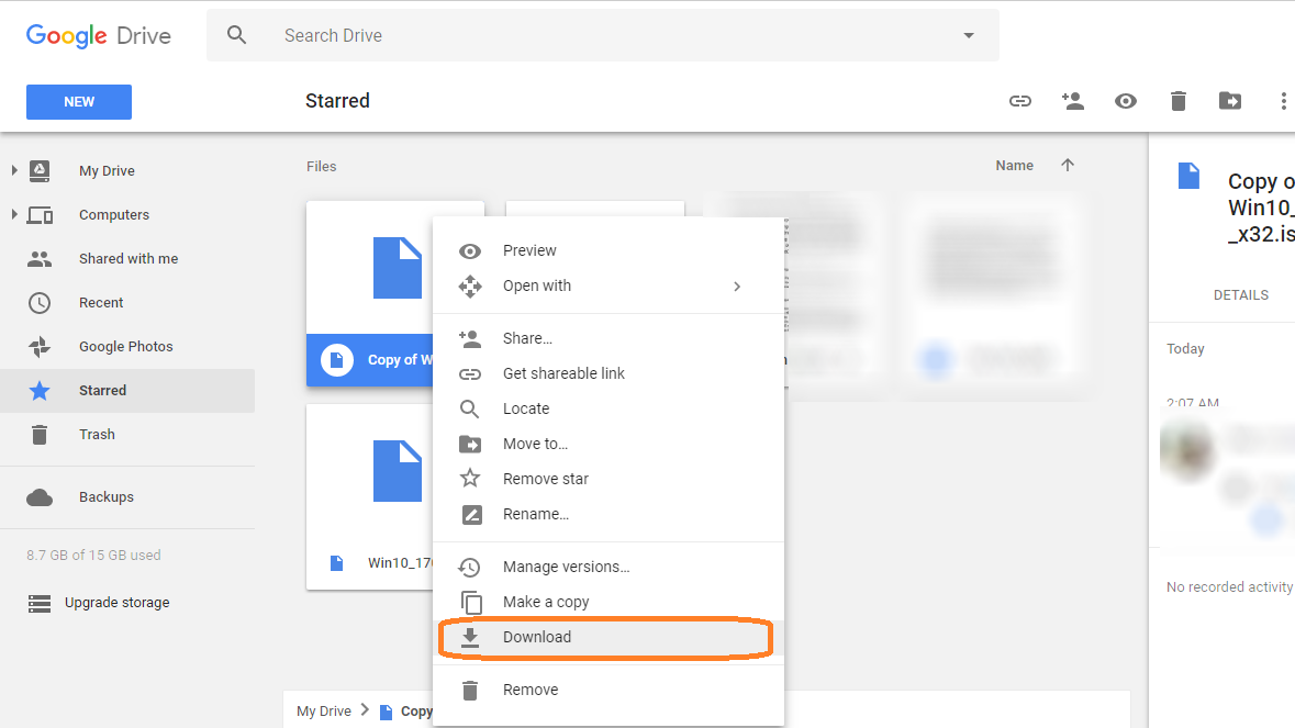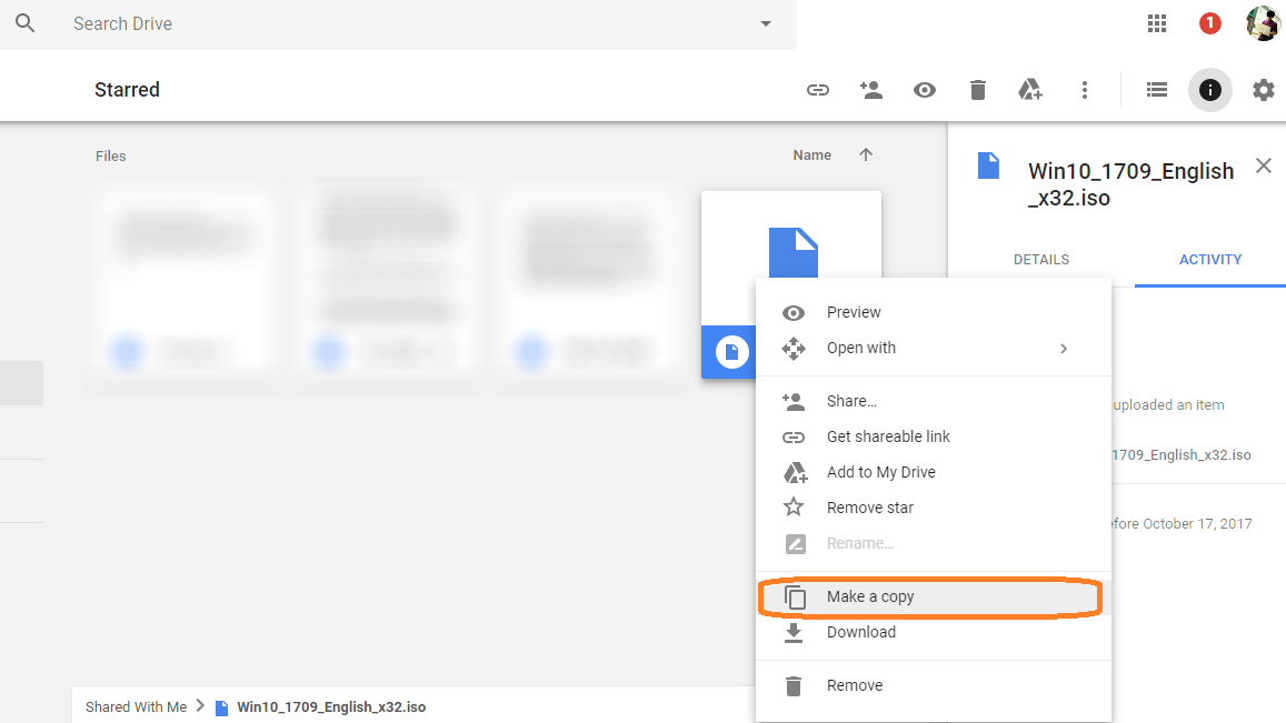 Bước 4: Bấm phải chuột vào file tài liệu vừa được thêm dấu sao của bạn → chọn Make a copy (Tạo bản sao). Lý do phải tạo bản sao vì bản gốc của bạn nếu chọn Tải xuống thì vẫn bị giới hạn lượt tải nhé.