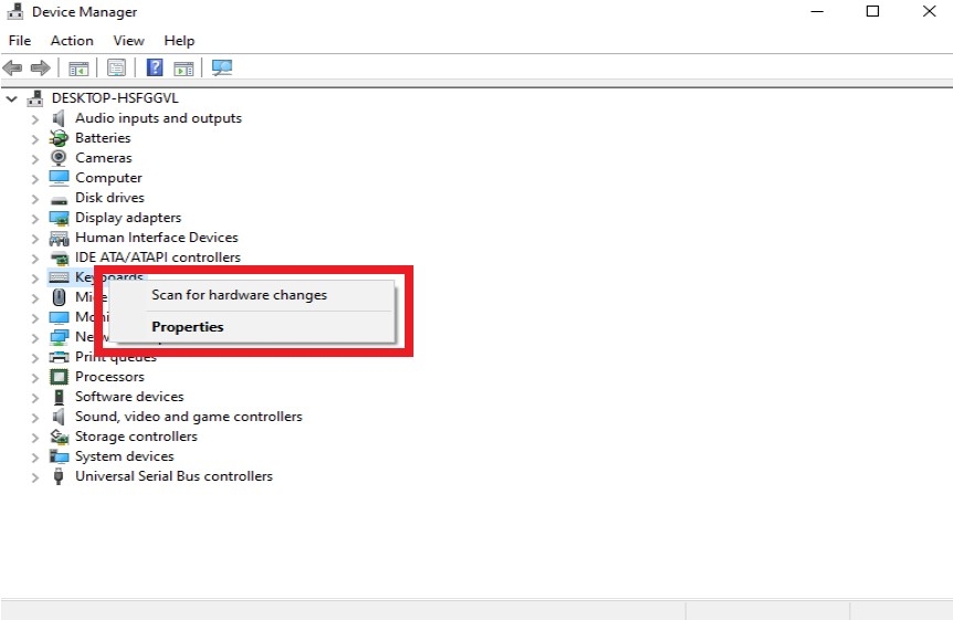 Kiểm tra lỗi: Chọn Scan for Hardware Changes để hệ thống kiểm tra bàn phím. Nếu có biểu tượng lỗi, nhấp chuột phải vào Keyboards và chọn Properties để xem chi tiết.
