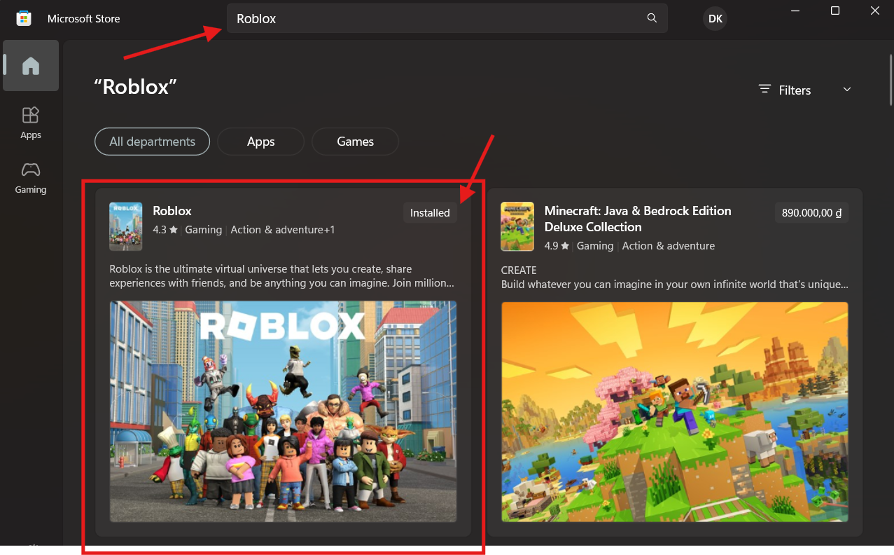 Bước 2: Trong ô tìm kiếm, gõ “Roblox” → chọn ứng dụng có biểu tượng chính thức của Roblox.
